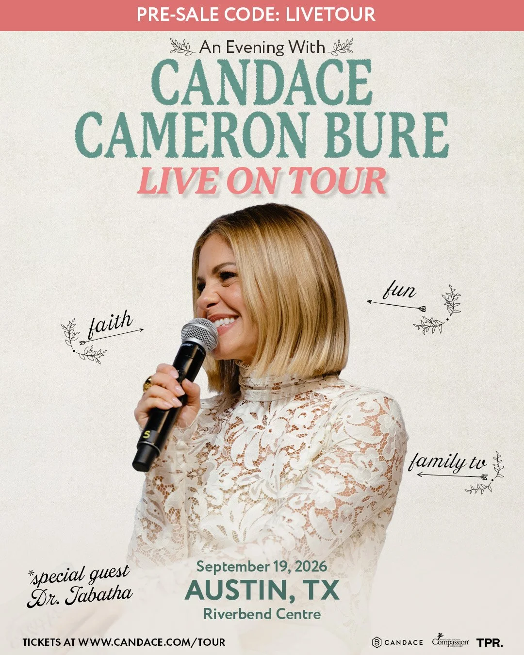 Just Announced! An Evening with Candace Cameron Bure and special guest Dr. Tabatha is coming to our Riverbend Centre on Saturday, September 19th! This two-hour experience filled with interactive games (prizes included!), heartfelt stories, and meaningful conversation rooted in faith is sure to be a night you will not want to miss -- and here's your chance for FIRST ACCESS to tickets! Use Pre-sale code: LIVESHOW at www.TPRlive.co to get your tickets today! Pre-sale ends Monday, 5/4 @ 10AM, so don't wait!
